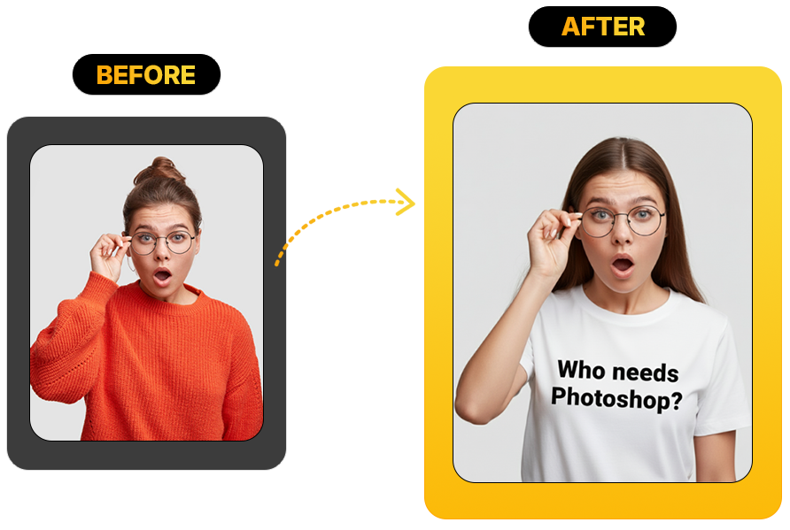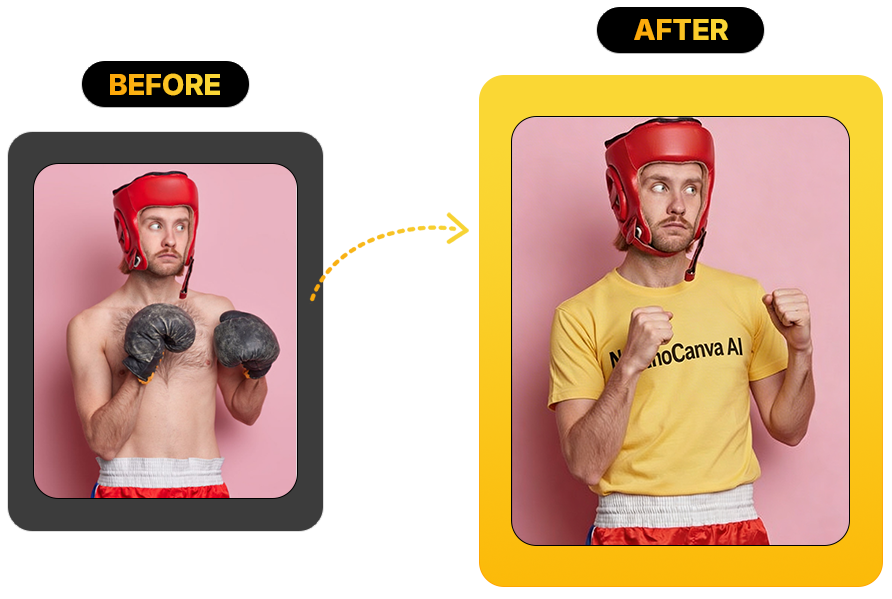 PROMPT: Add a yellow t-shirt with "NanoCanvas AI" written on it and remove the boxing gloves, keeping the pose and expression the same.