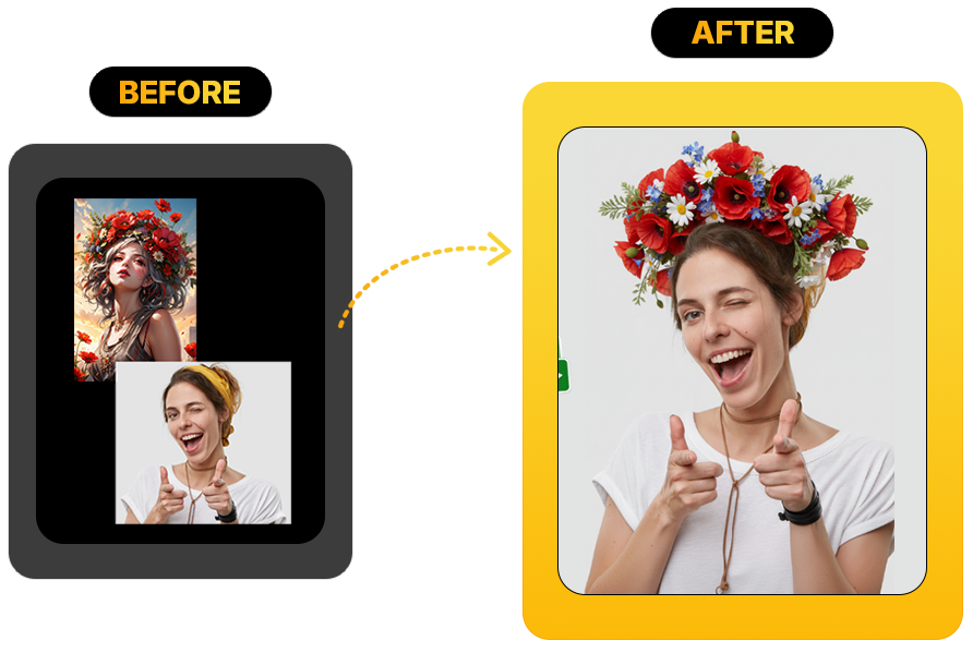 PROMPT: Swap the flower crown from the first image to the second, retaining the pose and expressions of the second image.