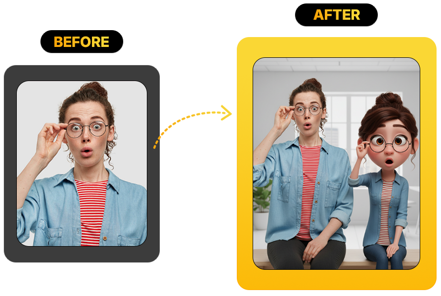 PROMPT: Create a 3D Disney Pixar version of the woman, seated beside her on a bench in an office, maintaining her pose, expressions, and attire.